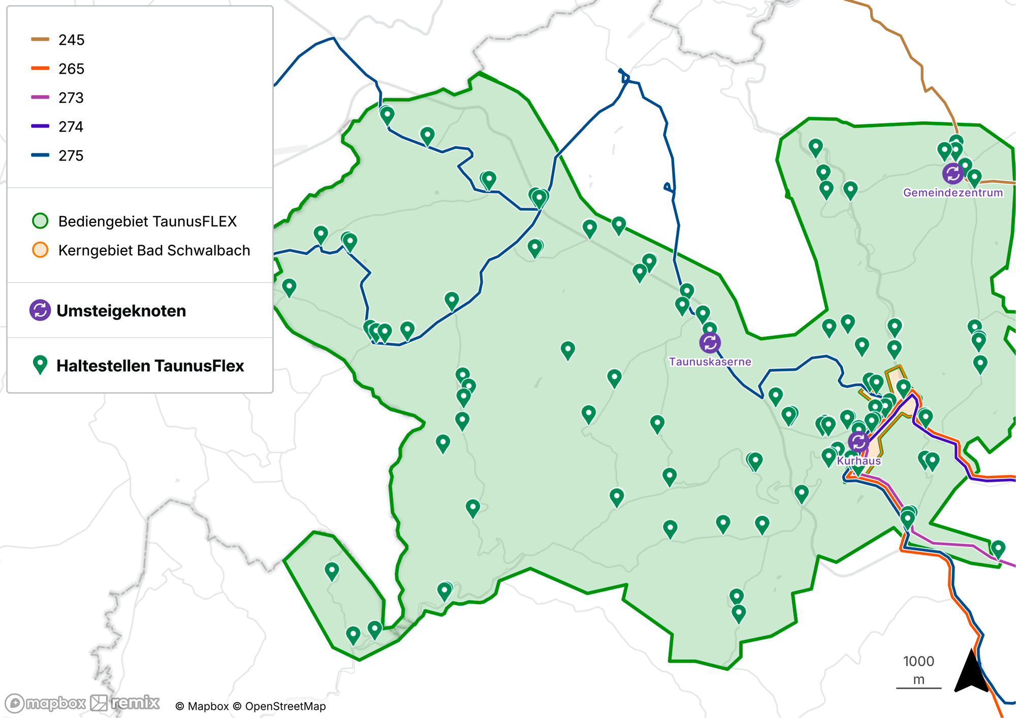 Orte, die bereits durch andere Linienbusse gut angebunden sind – z. B. Heimbach, Huppert und Laufenselden – sowie die Kernstadt Bad Schwalbach sind vom TaunusFLEX derzeit ausgenommen. Dadurch bleibt genügend Kapazität für die übrigen Ortsteile im Bediengebiet.